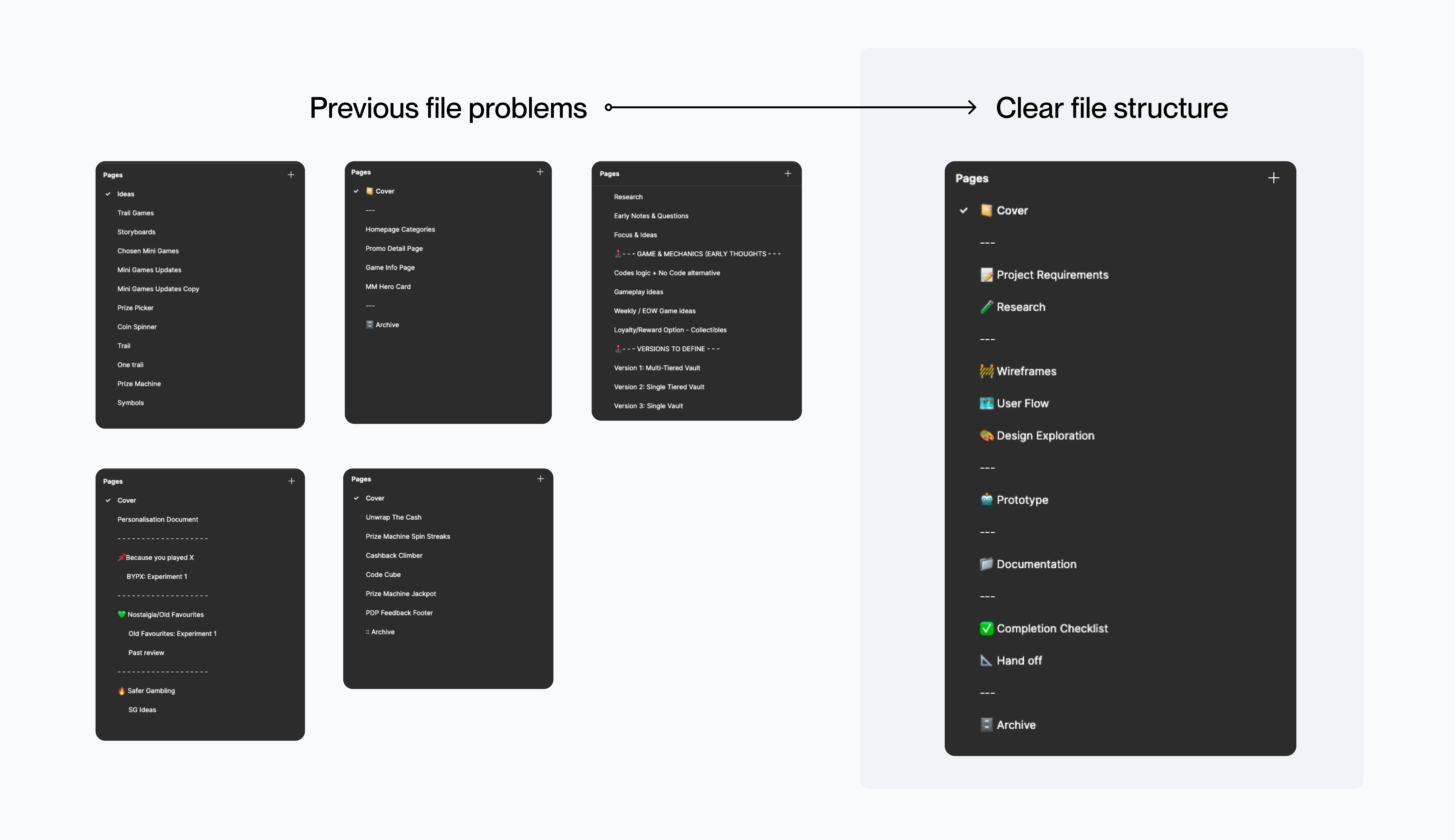 One of the first areas we wanted to explore was setting proper guides and structure in place to enable a systematic and scalable design system. We identified a few things that are not working such as our current file naming system and the issues it creates when other designers are looking through previous work and the handover process.