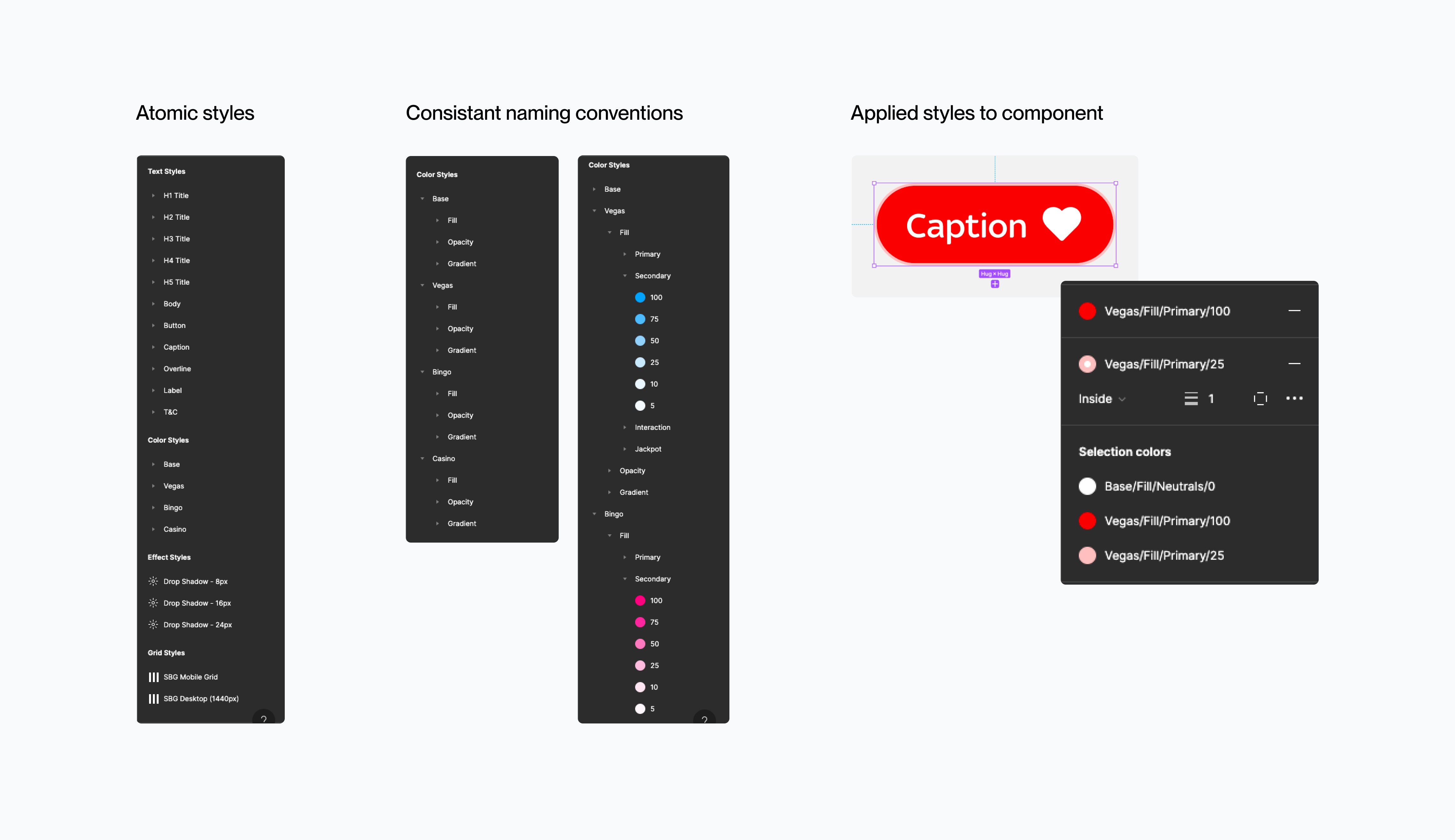 We set to take on the approach of atomic design. We started gathering of the atoms of our product. Looking at colours and their respective naming convention and how it can be applied across multiple brands. Typography and effect elements.